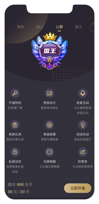 完善的贵族系统,分为游侠、骑士、公爵、国王,4个贵族等级,每个等级对应不同的用户权益。