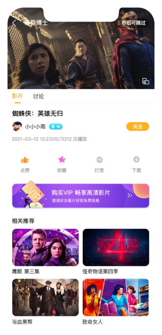 后台上传影片后前端即时观影,评论、点赞、下载等多种观影互动体验。