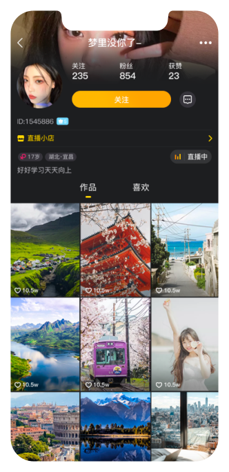 详细展示用户个人信息以及展示用户发布的笔记;直播小店展示位,一键查看商家上架商品。